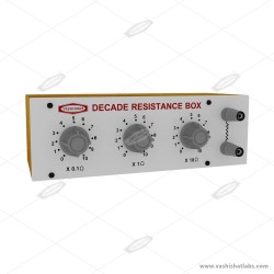 These Decade resistance boxes incorporate specially designed switches for precision and rapid measurement of resistance. Covering the ranges from 0.1 to 111,110 - Ohms. Each decade switch has 1 - 10 positions in addition to zero position. The dial assembly is mounted on a panel and enclosed in a metal / wooden box for protection from dust and acid fumes. All carbon metal film resistance values are of ± 1% tolerance and of 1% watts ratings. Provided with knobs having ribs for comfortable operation with 4 mm output socket terminals.
